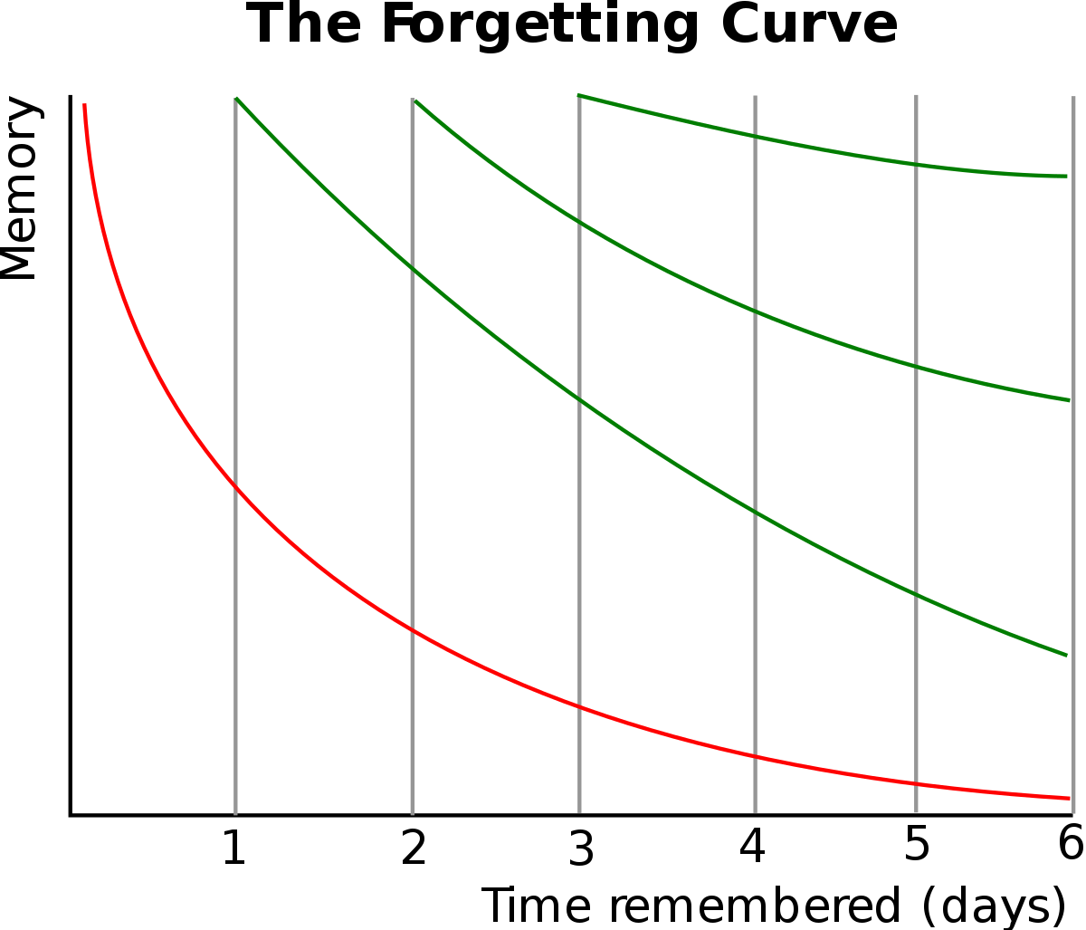 독일의 심리학자 헤르 밍 에빙하우스는 새로운 정보를 기억하려는 시도가 없을 때 기억에 얼마나 남아 있는지에 대해 망각곡선을 통해 보여준다. 망각곡선의 그래프는 며칠, 몇 주에 걸쳐 새로운 정보를 의식적으로 복습했을 때의 기억력이 상승하는 것을 확인할 수 있다.
