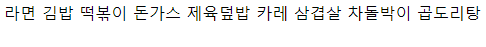 <p> 라면 김밥 떡볶이 돈가스 제육덮밥</p>