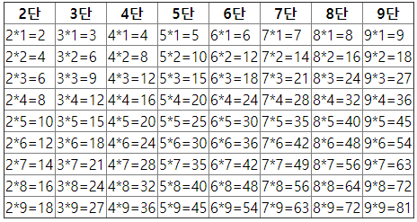 이상 javascript를 통해 body 태그의 입력없이 sciript로 구구단을 출력해보는 방법이었습니다.