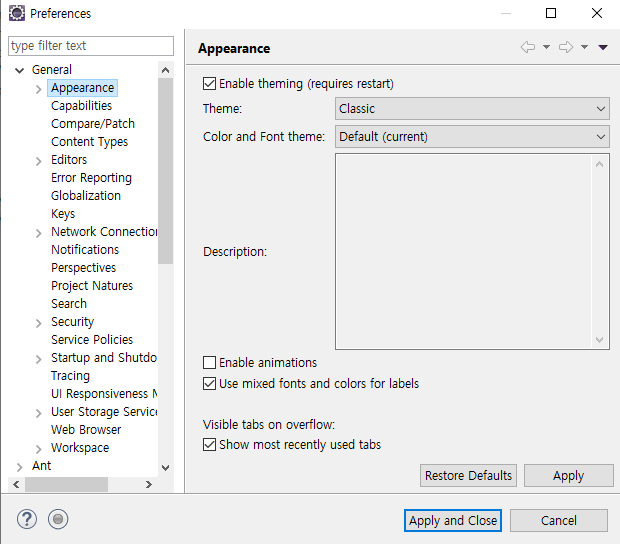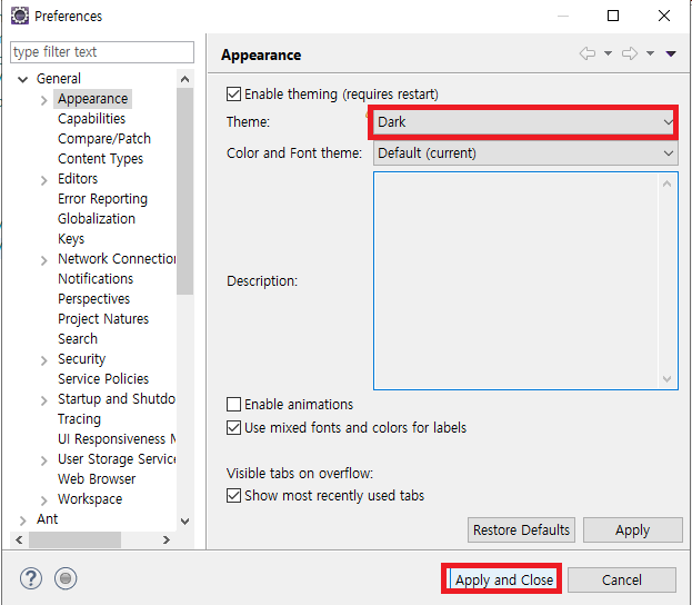 3. Theme를 Classic에서 Dark로 변경하고, 밑에 Apply and Close를 클릭합니다.