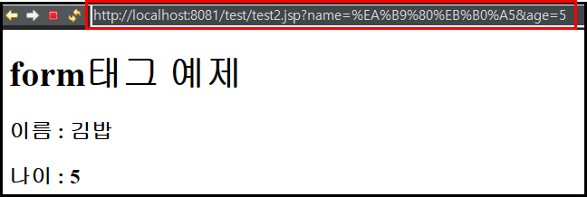 위의 사진은 test1.jsp 파일을 실행시킬 때 입니다. 이름과 나이를 각각 입력하고 제출버튼을 누르면,