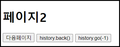 페이지 2라는 페이지가 열리며, 다음페이지로 갈지, history.back(), history.go(-1)의 버튼을 볼 수 있습니다.