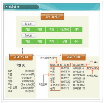스키마는 현실 세계의 특정한 한 부분의 표현으로서, 특정 데이터 모델을 이용해서 만들어진다.